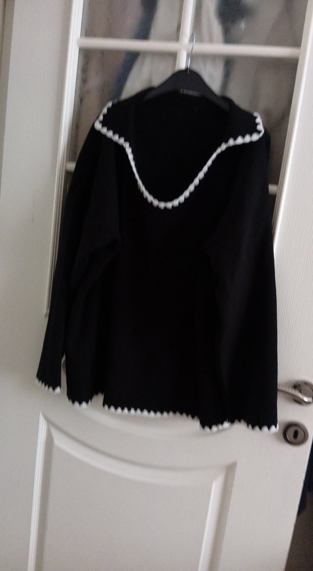 Siyah örgü kadın triko kazak, tekne yaka ve uzun kolludur. Gevşek kesim, midi boy ve beyaz kenar detayları bulunur.