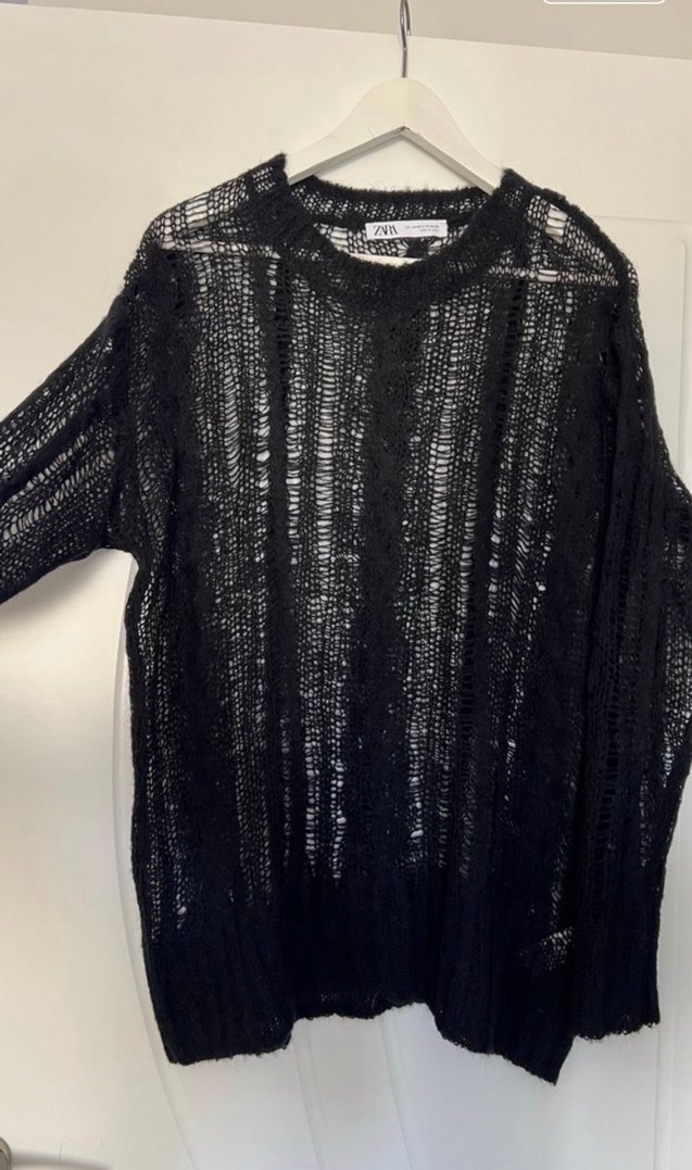 Siyah örgü, uzun kollu ve yuvarlak yakalı kadın triko kazak, bol kesim ve midi boyda. Desensiz tasarımıyla rahat ve şık bir görünüm sunar.