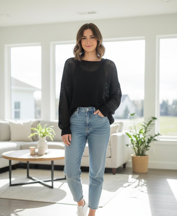 Siyah örgü denim kumaştan, uzun kollu, yuvarlak yakalı, bol kesim kadın triko sweatshirt. Günlük kullanıma uygun rahat bir model.