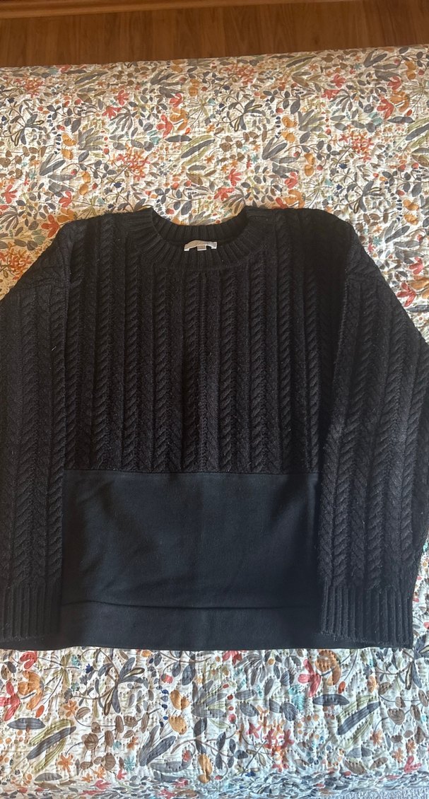 Bu siyah örgü kadın kazak, yuvarlak yaka ve uzun kollu olup, rahat ve bol kesim tasarımıyla günlük kullanıma uygundur. Üst jısmı örgü bel kısmı penyedir.iki kol arası 53 cm omuzdan bel uzunluğu 56 cm dir #Twist #kazak