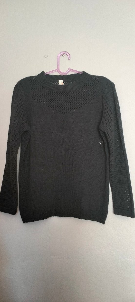 Siyah, uzun kollu, yuvarlak yakalı, örgü kumaştan yapılmış, vücuda oturan günlük kullanım için uygun rahat bir kazak.