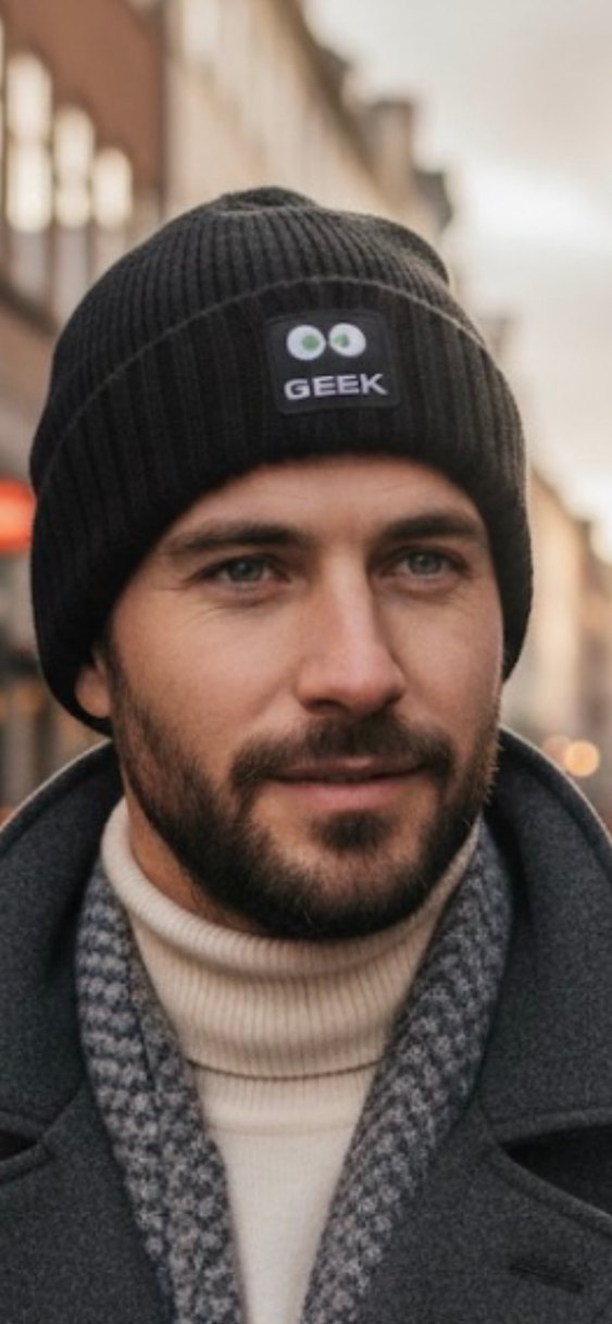 Siyah örgü yünden yapılmış bere, rahat bir uyum ve GEEK etiketiyle trend sokak tarzına uygundur. Yapay zeka ile giydirilmiştir