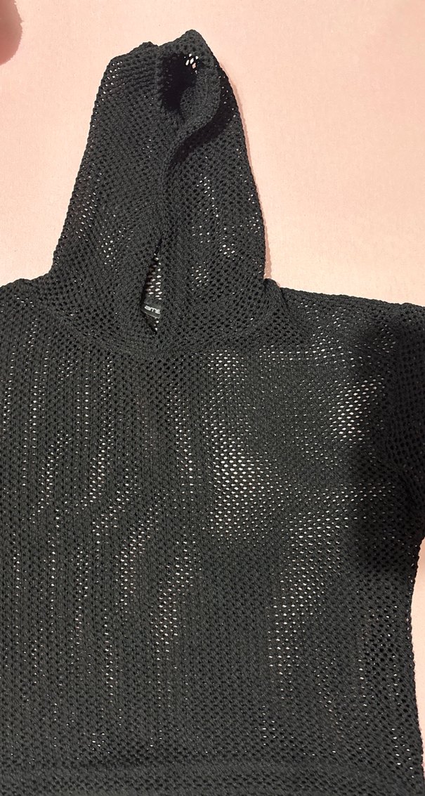 Kolsuz, örgü dokulu, yuvarlak yaka ve kapüşonlu siyah kadın kazak. Midi boyda ve dar kesim, outdoor için uygun.