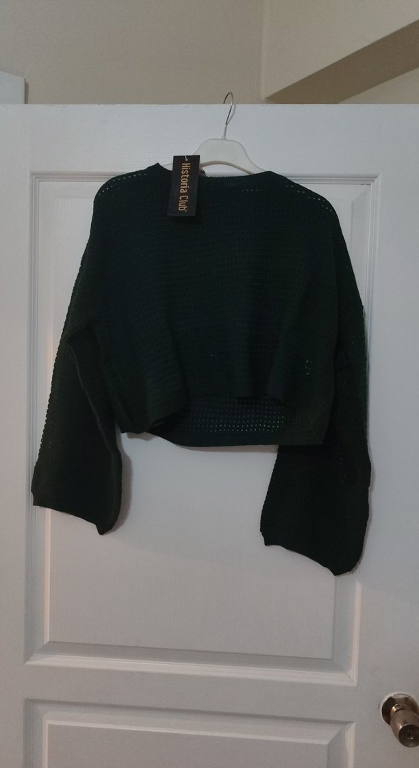Bu siyah örgü kazak, uzun kollu ve yuvarlak yakalıdır. Bol kesim ve kısa boyuyla rahat ve günlük kullanıma uygundur.