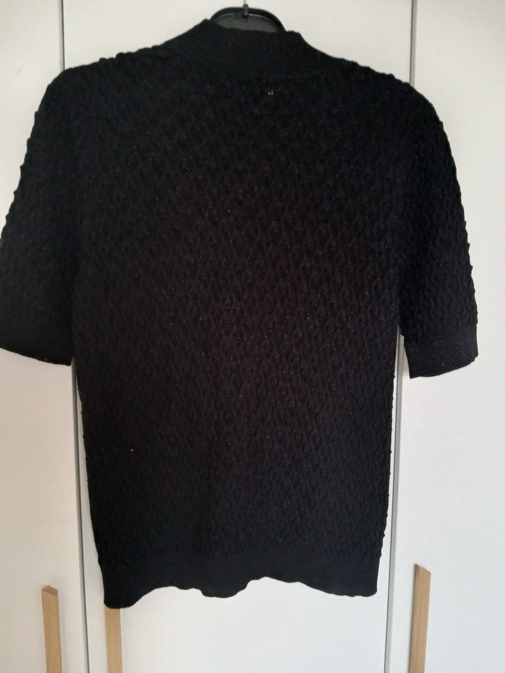Kısa kollu, boğazlı ve siyah örgü kumaştan yapılmış bu dar kesim kazak, günlük kullanım için hem rahat hem şık bir görünüme sahiptir.