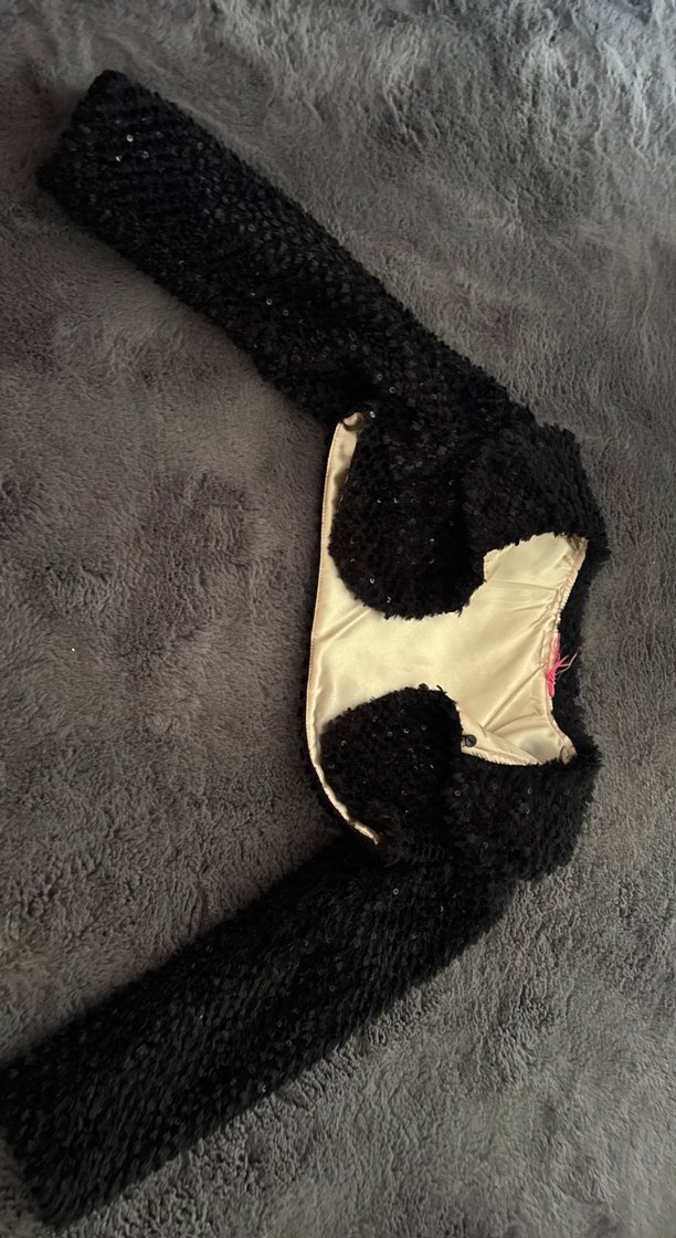 Örgü kumaştan, uzun kollu, yakalı ve siyah renkli, vücuda oturan kız bolero cekettir. Desensiz ve karşı kültür tarzındadır.