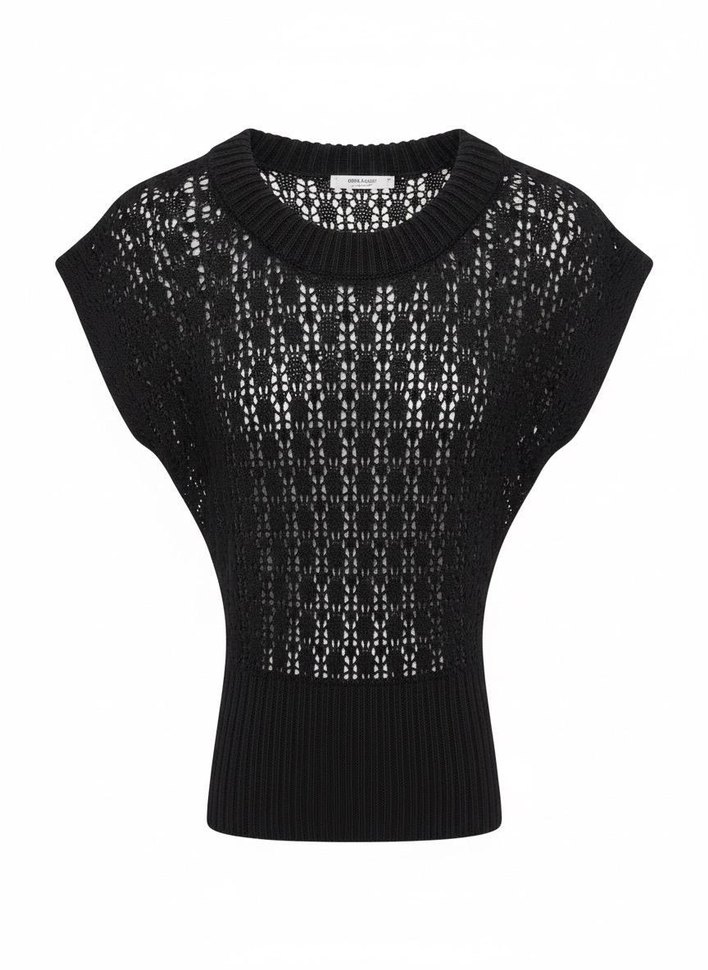 Siyah renkli, örgü kolsuz kazak. Yuvarlak yaka ve bol kesim ile kısa uzunlukta, minimalist tarzda günlük kullanım için uygundur.
