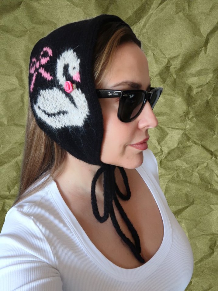 Siyah örgü bere, beyaz kuğu ve pembe fiyonk desenine sahiptir. Bohem ve gotik tarzı yansıtan, çene altında bağlanan tasarım.