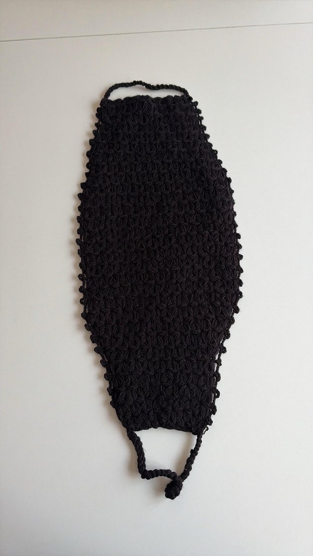 Bu siyah el yapımı örgü desene sahip, dokulu yüzeyi vardır. Tam kaplama sağlar ve askı halkası bulunur. banyo lifi. El örmesidir en kaliteli ipliklerle örülmüştür.