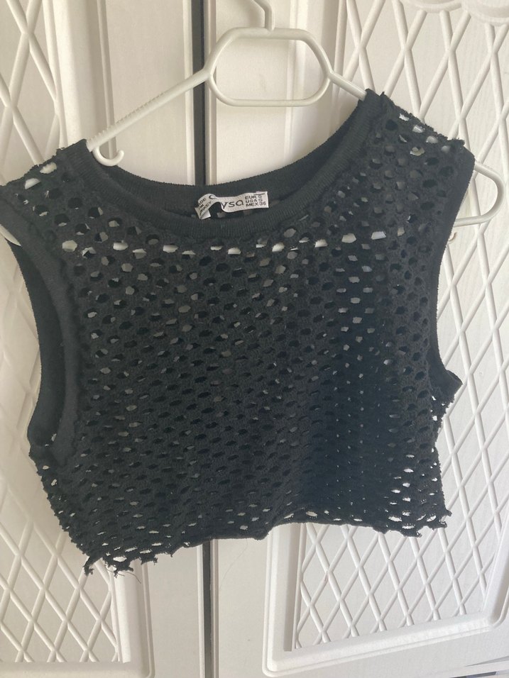 Siyah örgü kumaştan üretilmiş, kısa ve dar kesim, kolsuz crop Yuvarlak yaka