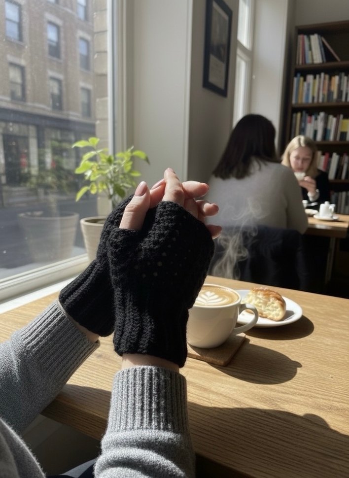 Siyah örgü parmakları açık kadın eldivenleri, gotik dokunuşlu rahat ve şık bir tarz sunar. Parmak hareketine izin verirken elleri sıcak tutar.