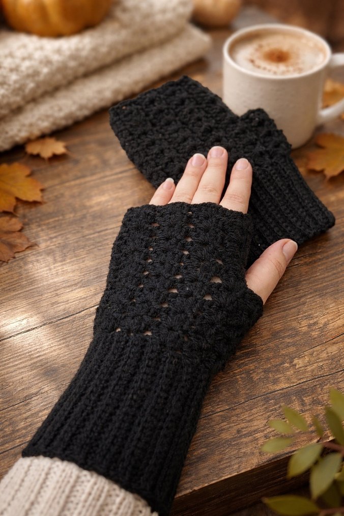 Siyah örgü, parmakları açık kadın eldivenleri, koyu goth tarzında ve rahat bir dokuyla. Elleriniz sıcak kalırken parmaklarınız özgür kalır.