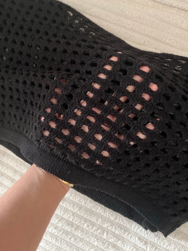Siyah örgü kumaştan, straplez yaka ve ince askılı, vücuda oturan midi boy croptur . Düz deseni ve günlük sokak stili için uygundur.