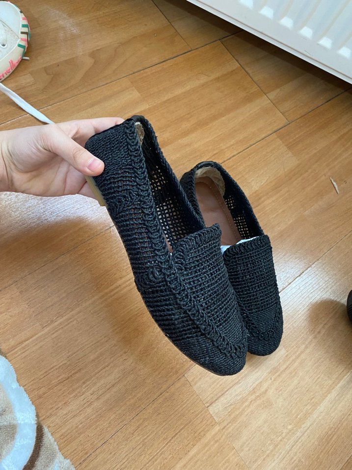 Siyah örgü topuklu espadril, minimal ve bohem tarzıyla günlük rahat kullanıma uygun.