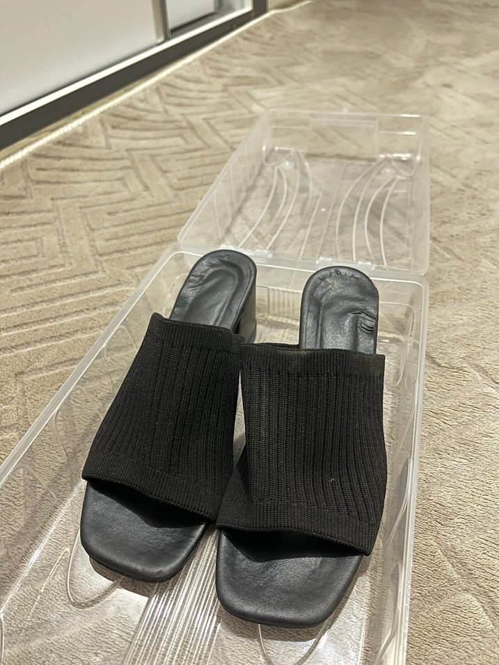 Siyah örgü üst kısmı ve topuklu tabanı olan kadın terliği. Kauçuk malzemeden üretilmiş, minimalist ve günlük sokak stili için uygun.