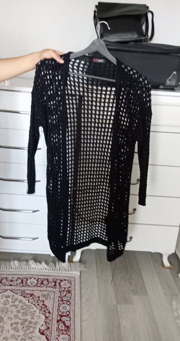 Siyah renkli, uzun kollu, V yaka ve bol kesim midi uzunlukta örgü triko hırka. Açık örgü deseniyle gotik ve rahat bir stil sunar.