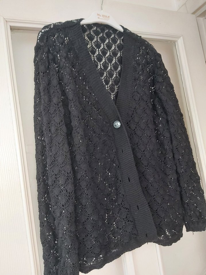 Siyah renkli, örgü yapıda, notched lapel yaka ve uzun kollu, midi boy, bol kesim kadın hırka. Rahat ve gotik tarzda, günlük kullanım için uygundur.