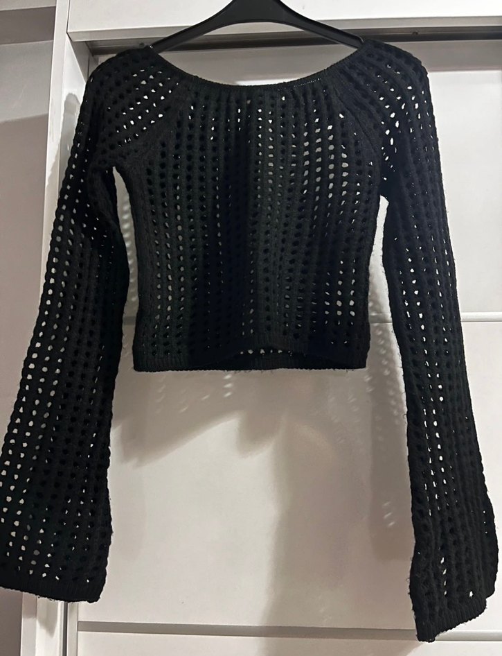 Siyah örgü kazak, tekne yaka ve uzun kollu, bol kesimdir. Gotik tarzda, normal uzunlukta ve günlük kullanıma uygundur.