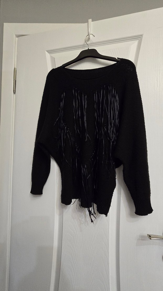 Bu siyah örme kazak, uzun kollu ve yuvarlak yakalı, bol kesimdir. Kısa boylu ve gotik tarzda püsküllü avant-garde detaylara sahiptir.
