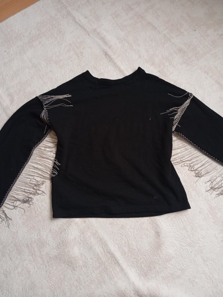 Bu siyah örgü kazak, salaş kesimi, uzun kolları ve bisiklet yaka tasarımı ile trend bir günlük kullanım sunar. Kollarındaki püskül detaylarıyla grunge punk tarzını yansıtır.
