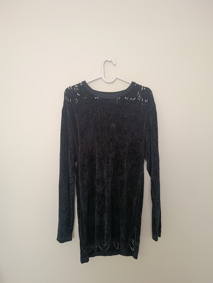 Siyah örgü, uzun kollu ve yuvarlak yaka kazak, salaş kesimiyle rahat bir kullanım sunar. Desensiz, gotik tarzda, günlük kullanım için uygundur.