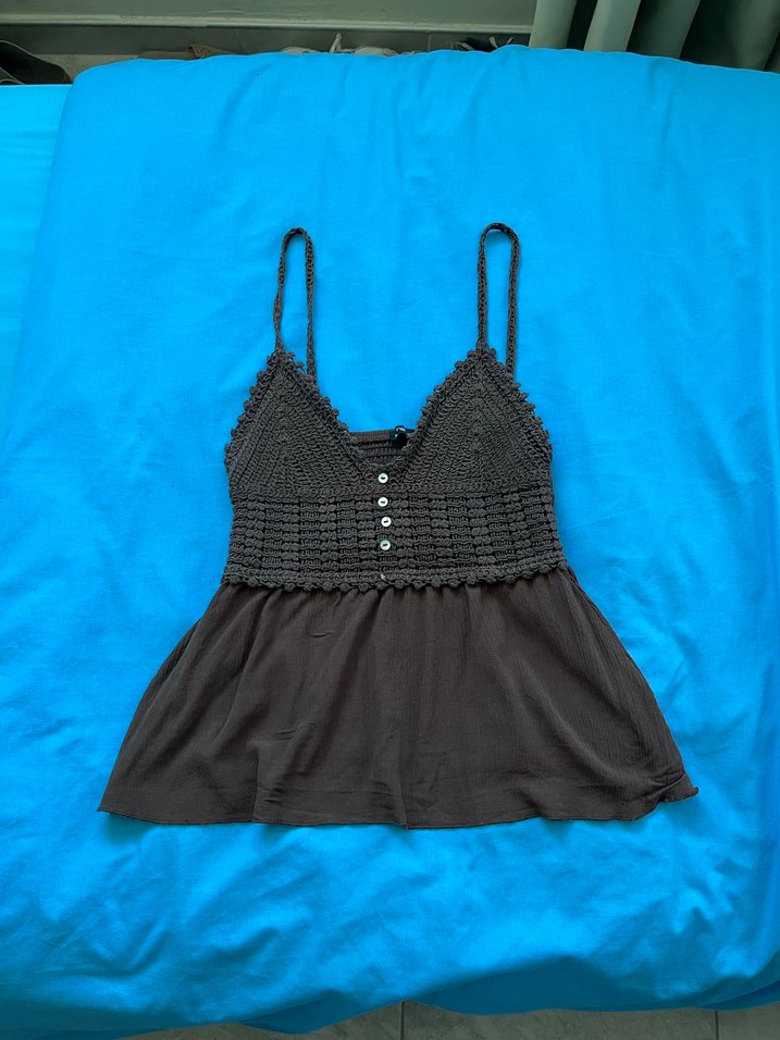 Siyah örgü kumaştan yapılmış, V yakalı ve ince askılı kadın büstiyer. Gevşek kesimi ve midi boyuyla gotik ve bohem tarzları birleştirir. Marka temsilidir 1 kere giyildi göğüs kısmı bana açık geldi rahat etmedim