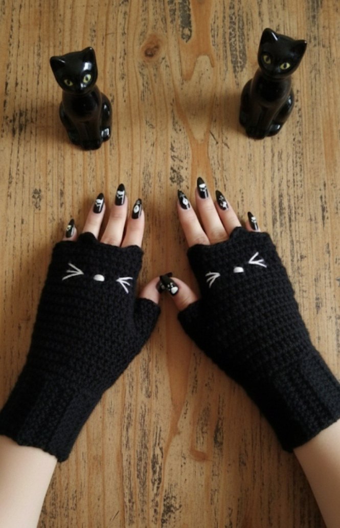 GÖRSEL BANA AİTTİR ✔️ İLAN AÇIYORUM ⬛ Siyah örgü yarım parmak eldivenler, sevimli kedi yüzü detayına sahip rahat bir tasarım sunar. Rock punk ve goth tarzına uygun. ⬛