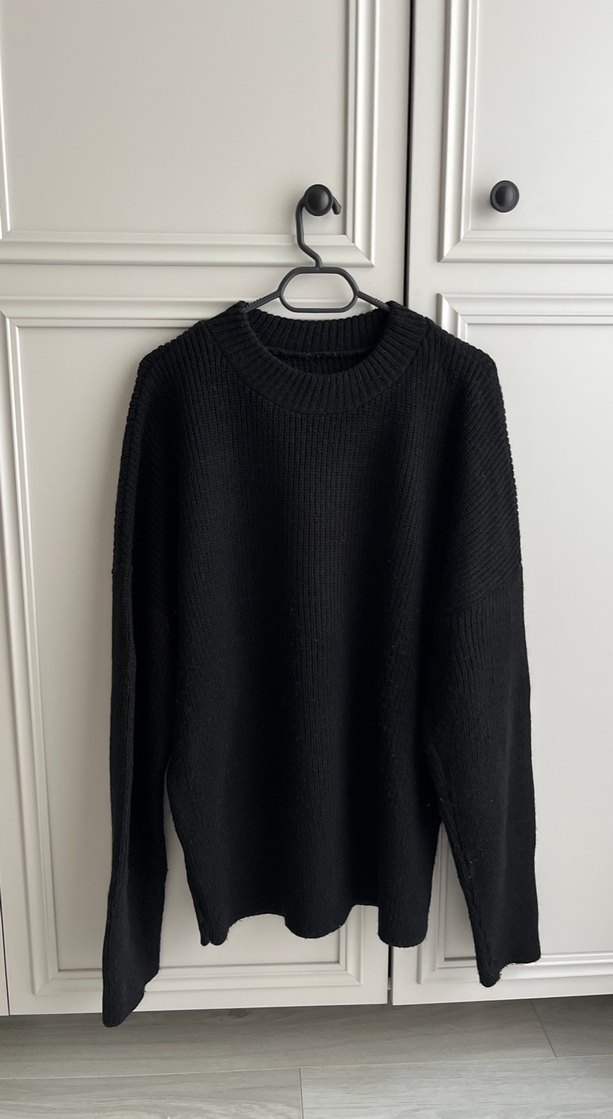 Siyah örgü yün kazak, salaş kesim ve yuvarlak yaka ile günlük kullanıma uygun sade ve rahat bir modeldir. Uzun kollu ve normal boyda.