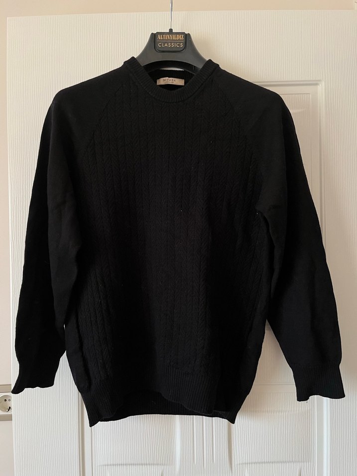 Siyah örgü yünden, yuvarlak yaka ve uzun kollu kadın kazak. Bol kesimli, klasik gotik tarzda, günlük kullanıma uygun.