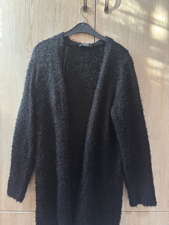 Siyah örgü yün hırka, rahat kesim, uzun kollu ve bisiklet yaka. Midi boyu ve sade tasarımıyla günlük kullanıma uygun goth tarzında. 75 cm uzunluğunda çok sıcak tutar küçük geldiği için satıyorum