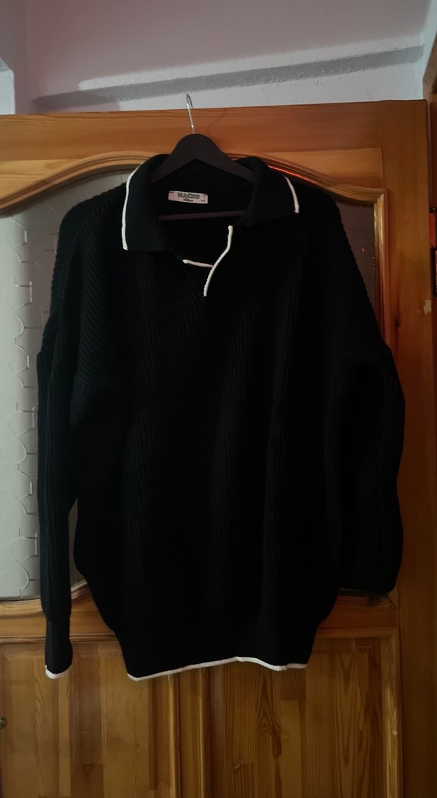 Siyah örgü yün kazak, uzun kollu, polo yaka, bol kesim ve midi boyda, gündelik ve rahat sokak stili için uygundur.
