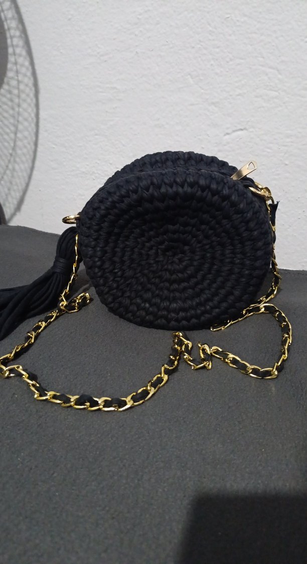 Siyah Örgü Zincir Detaylı Yuvarlak Çanta 20×20