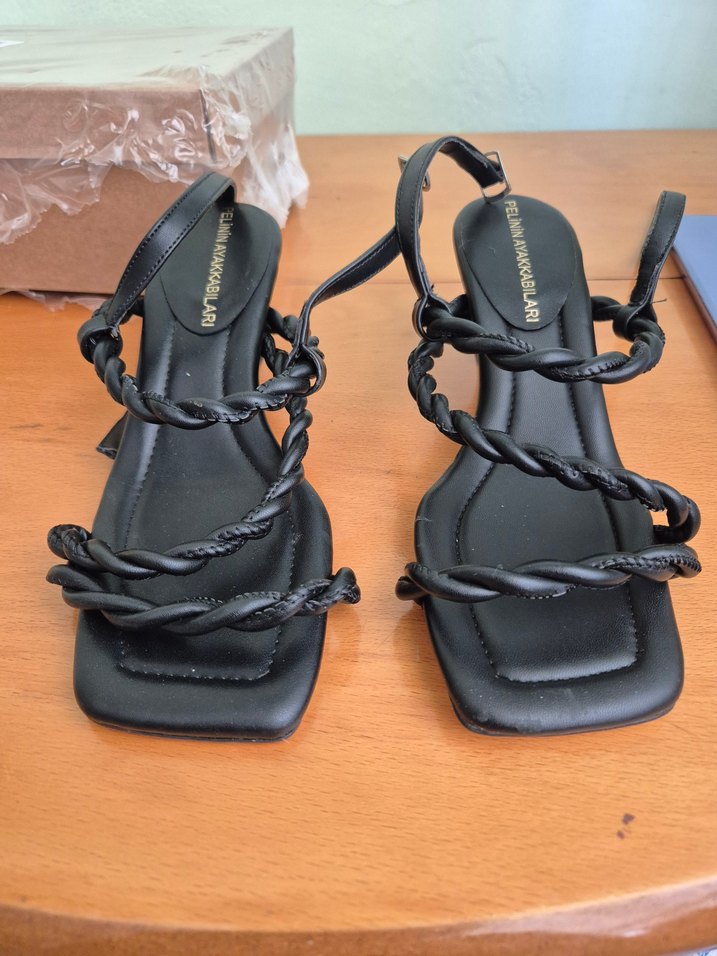 Siyah Örgülü Bantlı Topuklu Kadın Sandalet