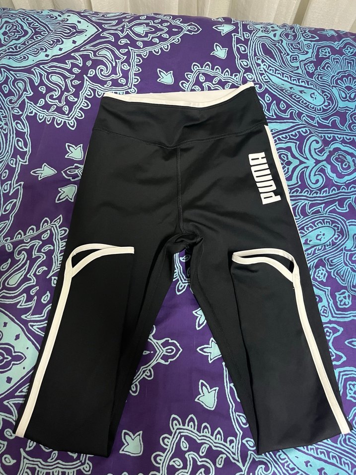 Siyah renkli, orijinal baskılı Xs beden Puma logolu ve yan çizgili, esnek sentetik kumaştan yapılmış, spor ve günlük kullanıma uygun, dar kesim tayt. ♀️
