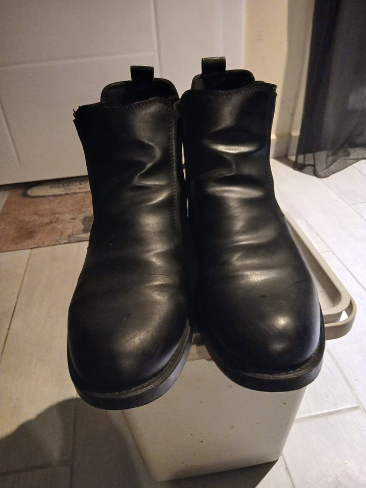 Siyah Orjinal Deri erkek botları. Minimalist gotik tarzda, günlük kullanıma uygun. Fotoğraflarda görüldüğü gibidir.Bor sorunu yoktur