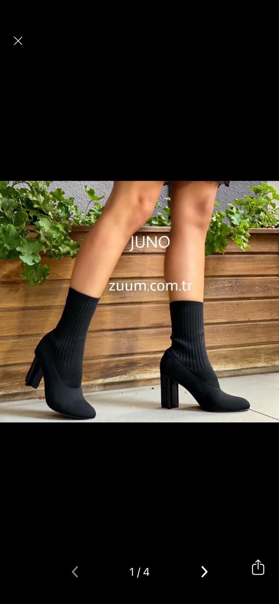 Siyah örme detaylı, blok topuklu kadın botu. Kauçuk malzemeden üretilmiş, rahat ve şık bir günlük kullanım seçeneği.