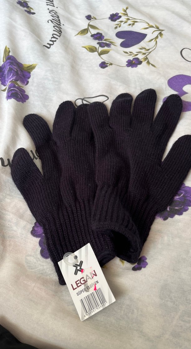 Siyah renkli, rahat ve temel tasarımlı örme kadın eldivenleri. Yumuşak triko kumaştan yapılmıştır, sıcaklık ve sadelik sunar.