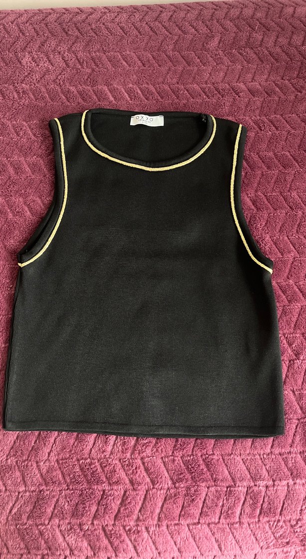Siyah kolsuz yelek, fitted kesim ve yuvarlak yaka ile sarı ince şerit detayına sahip. Yumuşak sentetik kumaştan üretilmiş, günlük sokak stiline uygun.