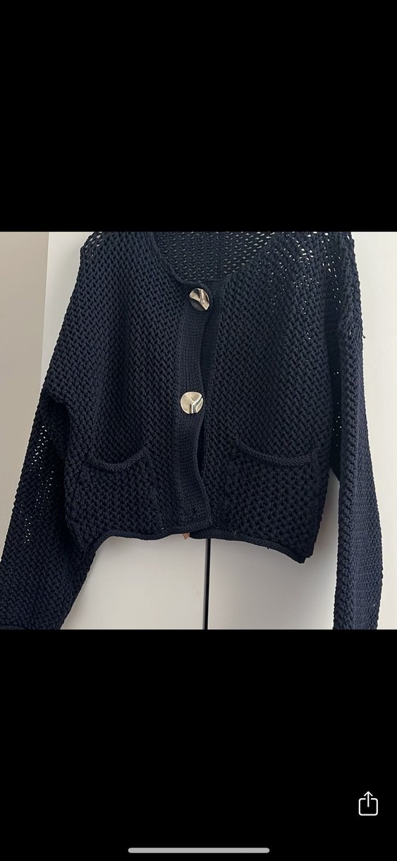 Siyah renkli, kısa boy ve fitted kesim örme kadın hırka. Uzun kollu, yaka tipi kesik yaka, iki ön cep bulunur. Rahat ve şık sokak stili için uygundur.