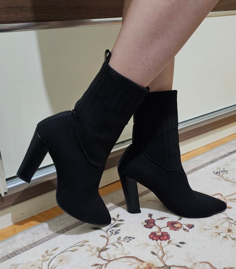 Örme üst kısmı ve ince topuklu siyah botlar, hafif yılan derisi desenlidir. Kauçuktan yapılmış, rahat ve gotik tarzda.