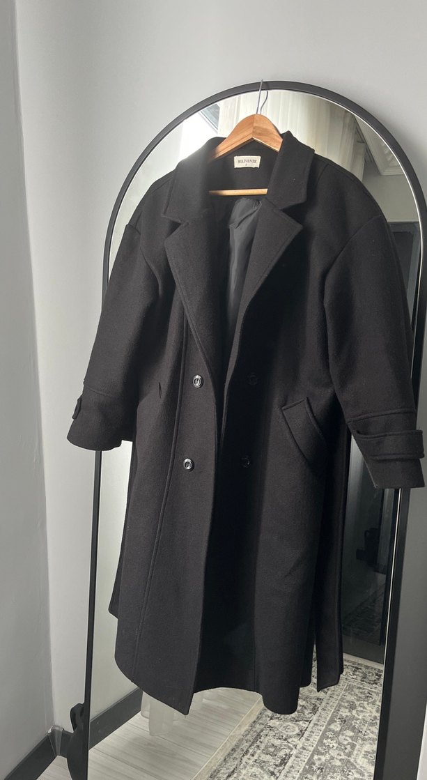 Siyah uzun kaban, çift düğmeli ve yaka detaylıdır