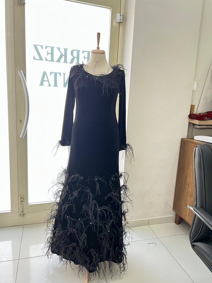 Siyah uzun kollu abiye elbise, Otiş detaylarıyla süslenmiş, kayık yaka ve normal kesimlidir. Düğünler için uygundur. Özel Dikim