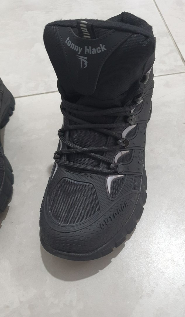 Dayanıklı kauçuk malzemeden yapılmış siyah erkek outdoor botları, velcro ve bağcıklı kapanışa sahip. Su geçirmez. 39 numara yazıyor fakat 38 numara giyenler için uygundur, dar kalıptır.