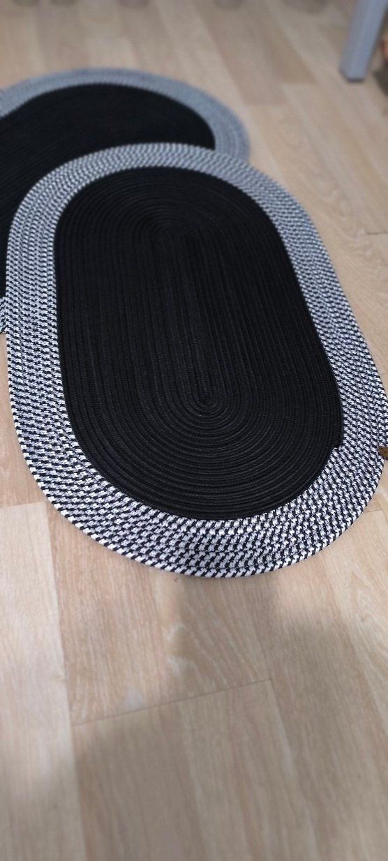 Doku yüzeyli, siyah oval banyo paspası, kenarında kontrast renkli bordür bulunur. jüt paspas #jüt paspas #hasirpaspas #jütbanyosalonpaspasi