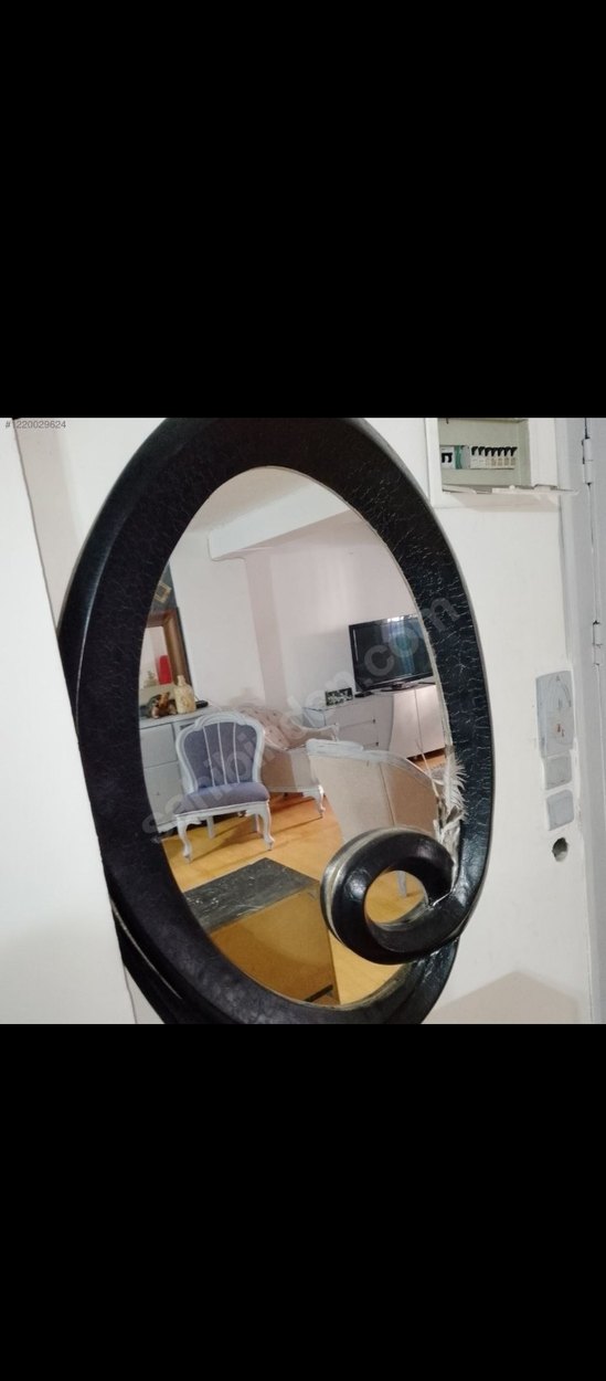Siyah oval çerçeveli, alt kısmında kıvrımlı dekoratif detay bulunan duvar aynası. Her ortama uyum sağlar.