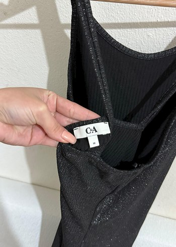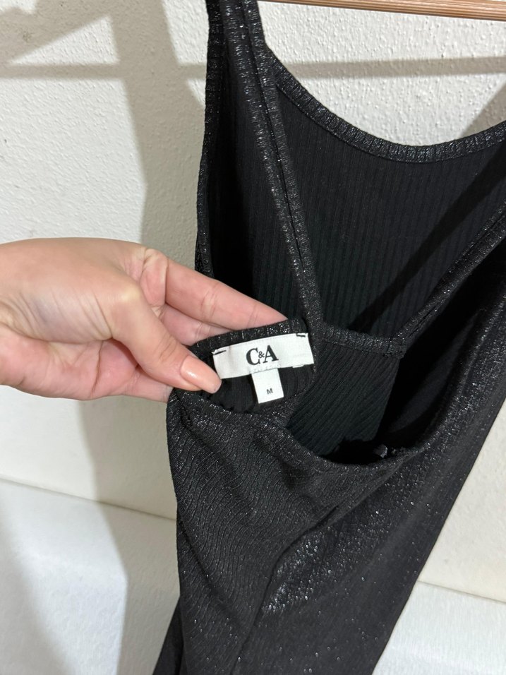 Oval yaka, ince askılı, siyah fitilli triko elbise. Midi boyda, fermuarlı ve yumuşak sentetik kumaştan, rahat sokak stili için uygundur.