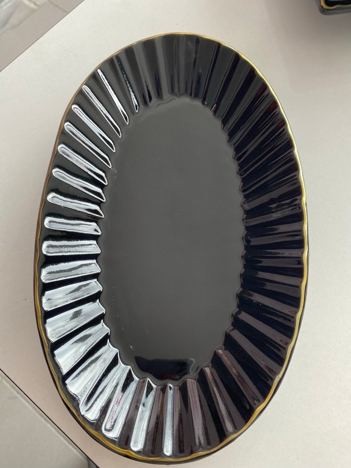 Siyah oval, dokulu çerçevesi ve hafif altın kenarıyla şıklık katan yemek tabağı. Stok vardır kaç adet sipariş etmek isterseniz iletişime geçebilirsiniz ilan açarım.