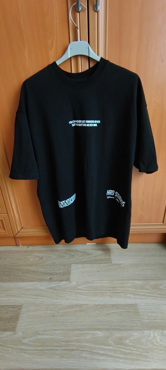 Kısa kollu, bisiklet yaka, siyah oversize erkek tişört. Sentetik kumaştan, baskılı deseniyle günlük kullanıma uygun. ✨