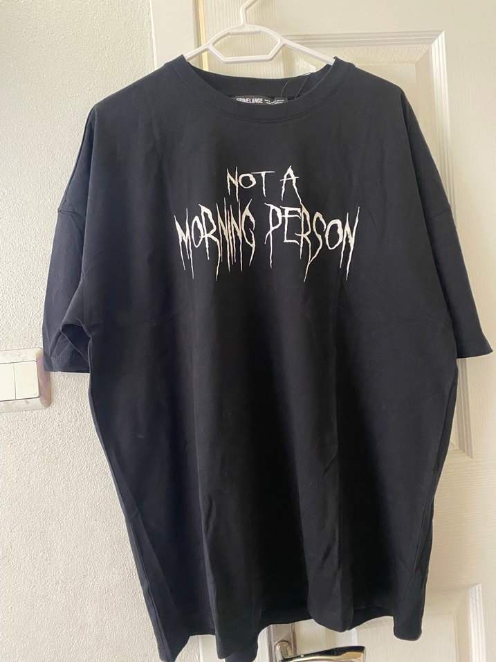 Siyah, oversize kesim, kısa kollu hamile tişörtü. 'NOT A MORNING PERSON' baskılı, nefes alabilir keten kumaştan, günlük kullanım için uygun, grunge punk tarzında.