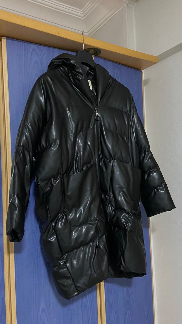 • Siyah, oversize kesim şişme mont • Deri görünümlü dış yüzey (soft parlaklık) • Kapüşonlu, fermuarlı model • Sıcak tutan dolgulu yapı • Temiz kullanıldı, aşırı yıpranma/yırtık yok • Orta seviyede kullanılmıştır (çok fazla değil) • Beden: Oversize kalıp (S–M–L rahat olur) • Kış için ideal, su tutmayan yüzey